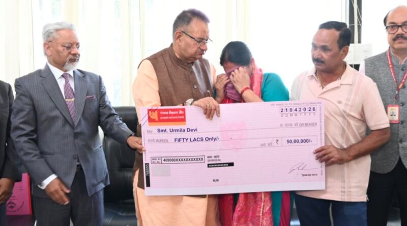 देहरादून। सैनिक कल्याण मंत्री गणेश जोशी ने अपने कैंप कार्यालय में दिवंगत उपनल कर्मचारी कविता गुसाईं के परिजनों को उपनल द्वारा पंजाब नेशनल बैंक के सहयोग से ₹50 लाख की शेष बीमा राशि का चेक प्रदान किया। इस दौरान दिवंगत कर्मचारी की आत्मा की शांति के लिए दो मिनट का मौन रखकर श्रद्धांजलि अर्पित की गई।